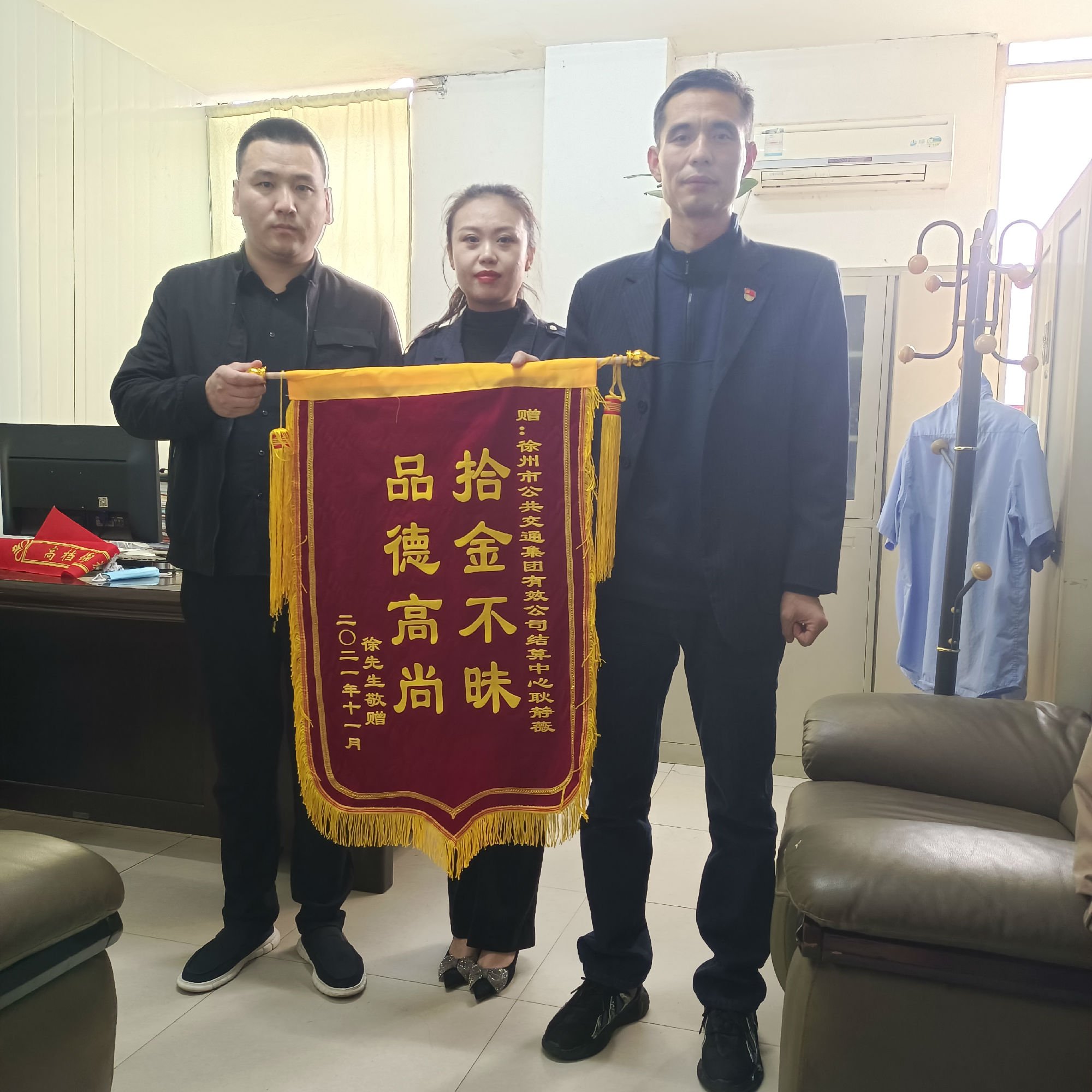 原來(lái)11月2日早上,結(jié)算中心職工耿靜薇在上班途中,經(jīng)過(guò)夾河街路口時(shí),無(wú)意中發(fā)現(xiàn)一個(gè)黑色手包,等待許久未見失主前來(lái)尋找,便將手包帶到了公司。經(jīng)檢查,包內(nèi)有銀行卡,手機(jī)及部分現(xiàn)金,但未找到任何聯(lián)系方式,這時(shí)失主的手機(jī)鈴聲響起,傳來(lái)了失主焦急的聲音。不一會(huì)兒,失主徐先生趕到結(jié)算中心,領(lǐng)回了物品。次日,徐先生特意送來(lái)錦旗,并表示衷心的感謝!
