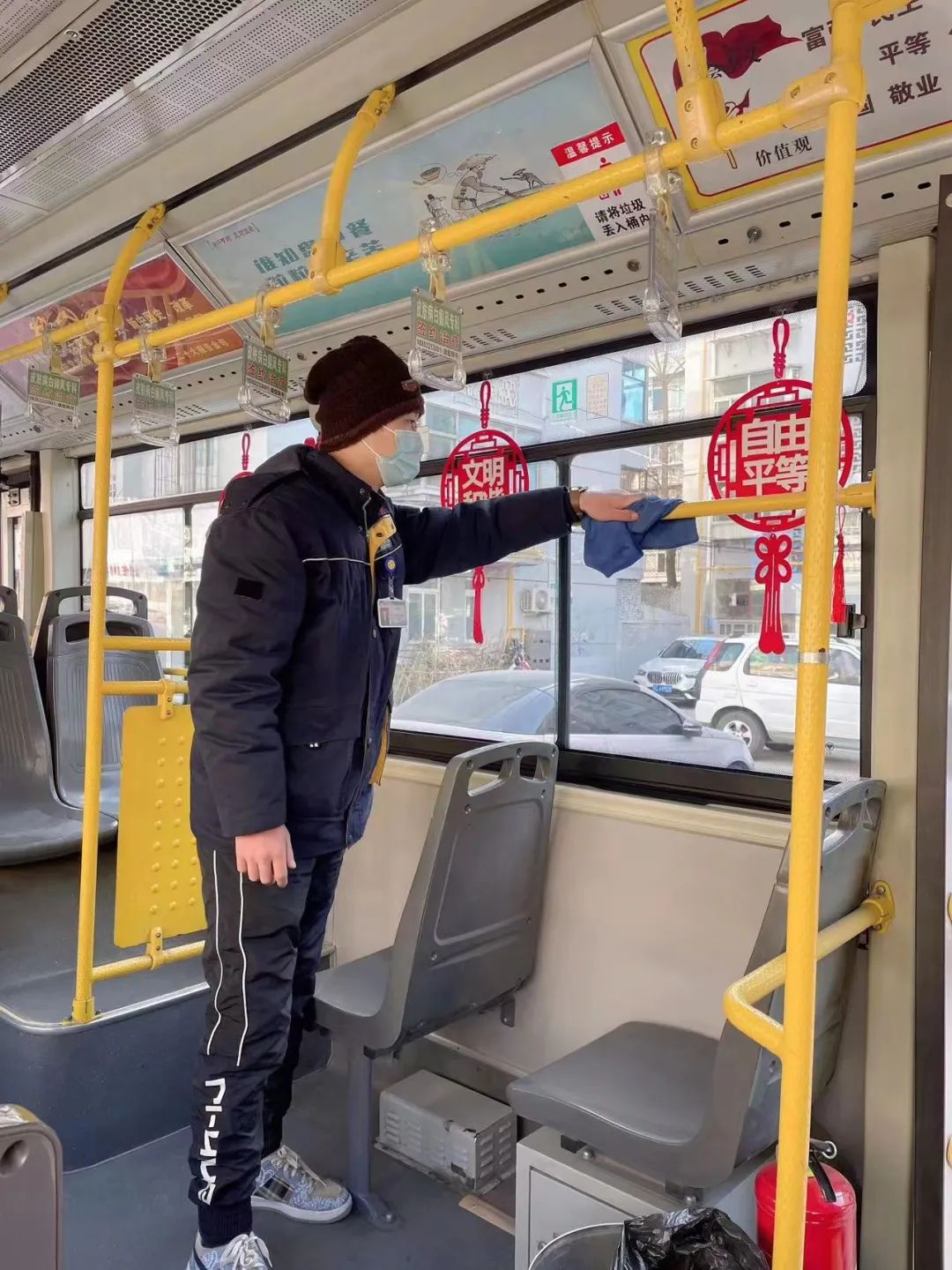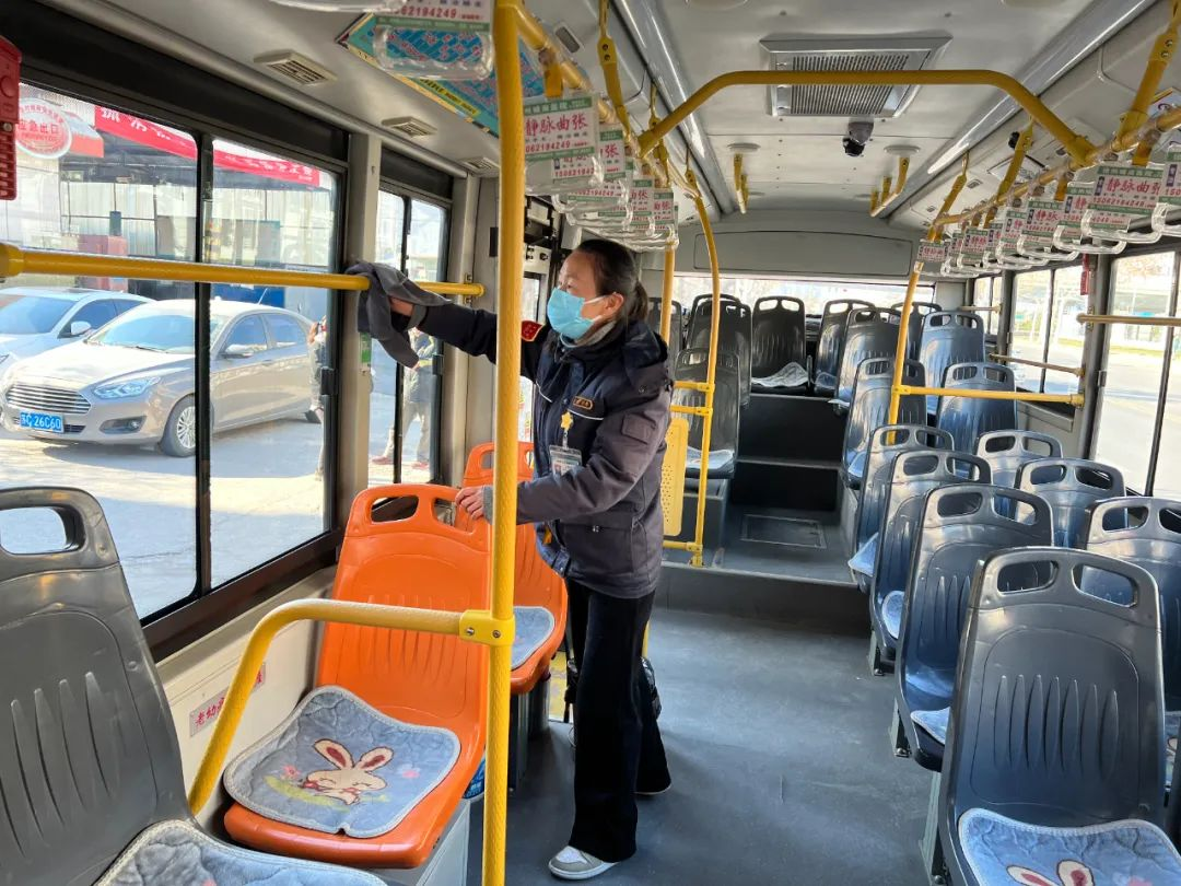 王海芬跑的這條線路,穿過(guò)數(shù)條主干道,經(jīng)過(guò)工人醫(yī)院、兒童醫(yī)院等一個(gè)個(gè)醫(yī)療中心。“這幾天有一位乘客,兒子剛動(dòng)完手術(shù),他每天要到醫(yī)院送飯。每次上車,我們都會(huì)互相寒暄幾句,心里也暖暖的。”為了自己的健康也為了他人的健康,王海芬利用休停時(shí)間把座椅、扶手等地方用消毒液進(jìn)行擦拭,每一趟的間隙開(kāi)窗通風(fēng),保證車內(nèi)空氣流動(dòng),她在車內(nèi)配備了藥箱,里面有口罩等防疫物資以備乘客不時(shí)之需。