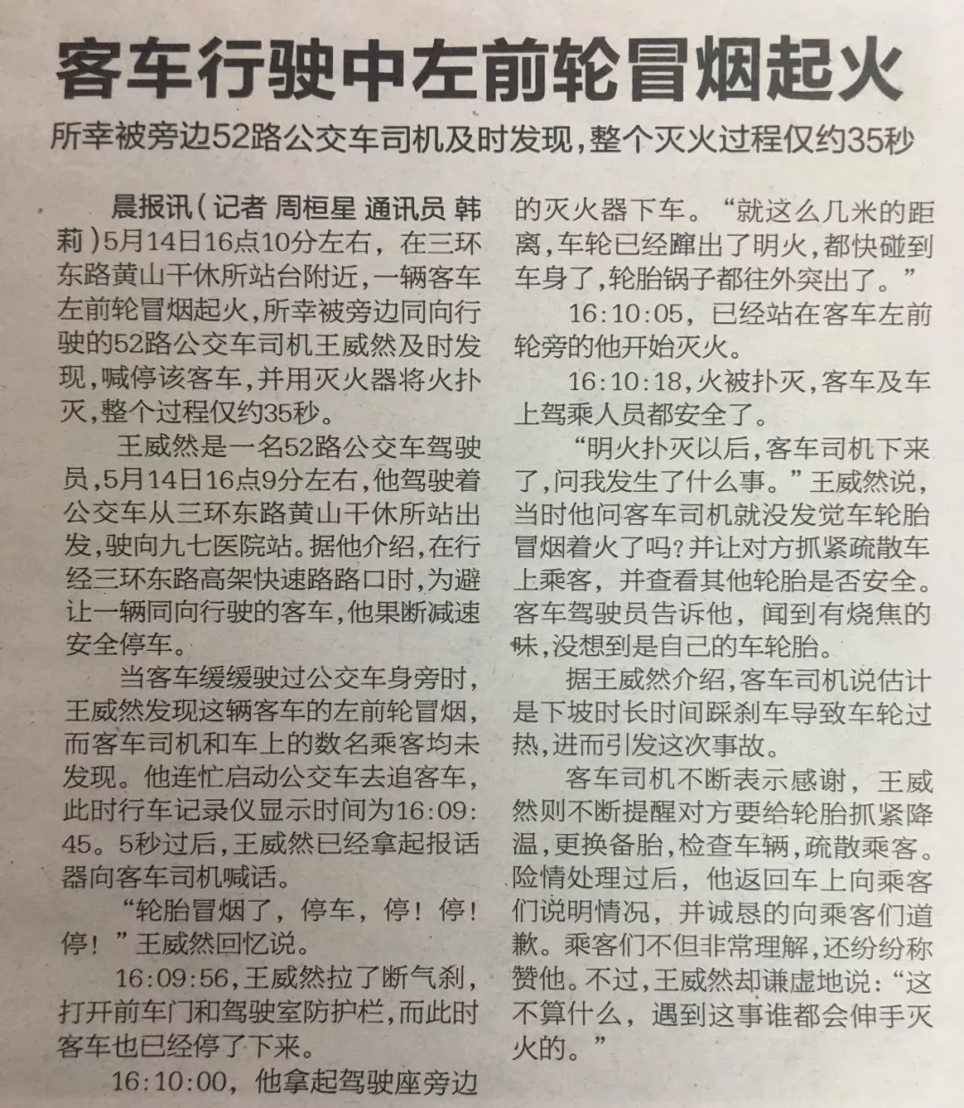 5月14日16點10分左右,在三環(huán)東路黃山干休所站臺附近,一輛客車左前輪冒煙起火,所幸被旁邊同向行駛的52路公交車司機王威然及時發(fā)現,喊停該客車,并用滅火器將火撲滅,整個過程僅約35秒。