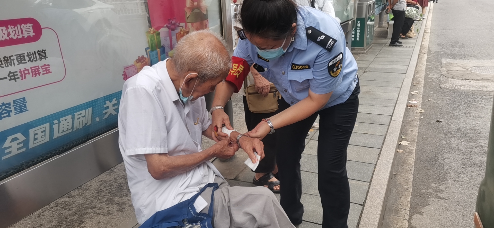 8月2日上午8時許,公交督導(dǎo)員孫琪在朝陽站開展站臺執(zhí)勤工作時,突然聽到有人大喊:“快來救一下,有人摔倒了!”孫琪當即上前查看情況,發(fā)現(xiàn)一位老人癱坐在站臺上,不停地喘著粗氣,胳膊上有一個大傷口,鮮血直流。