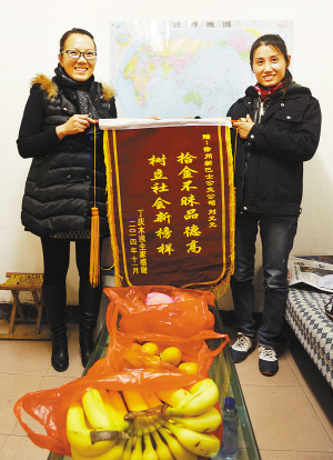 10月17日,乘客丁女士將“拾金不昧品德高、樹立社會新榜樣”的錦旗送到8路駕駛員劉元元和車隊領(lǐng)導(dǎo)手中。