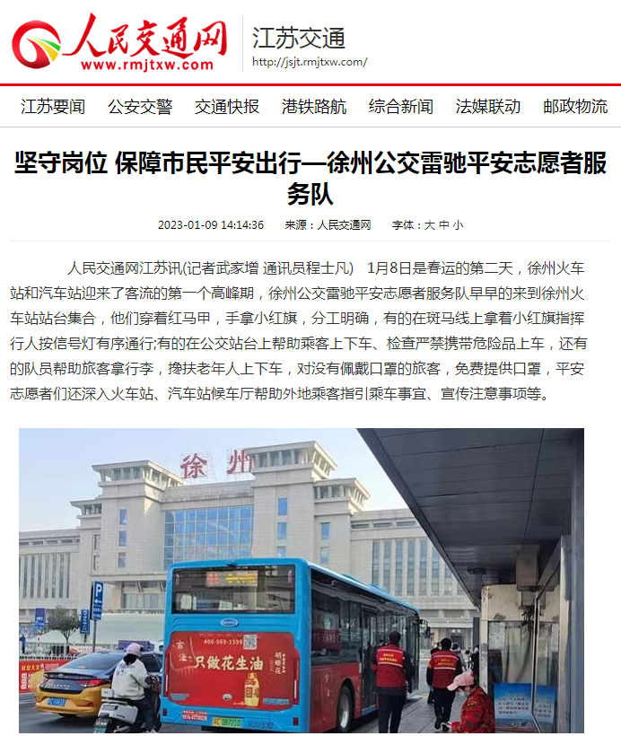 1月9日,人民交通網(wǎng)刊發(fā)文章《堅守崗位 保障市民平安出行—徐州公交雷馳平安志愿者服務隊》