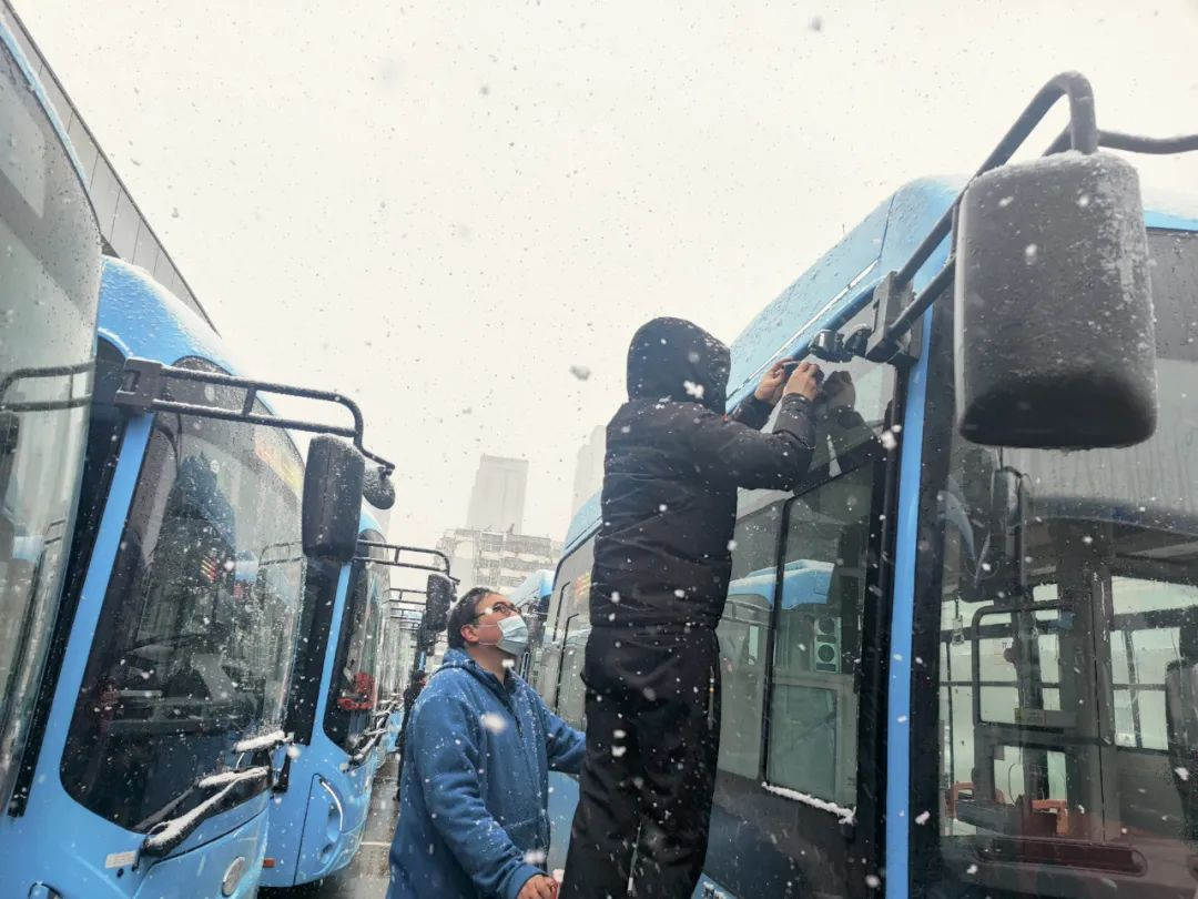 1月14日上午,徐州市氣象臺(tái)發(fā)布道路結(jié)冰黃色預(yù)警[Ⅲ級(jí)/較重],氣溫驟降,徐州迎來(lái)了2023年第一場(chǎng)冬雪。面對(duì)寒潮雨雪冰凍惡劣天氣,公交集團(tuán)立即啟動(dòng)特殊天氣應(yīng)急預(yù)案,集團(tuán)黨委委員、副總經(jīng)理丁玉華帶領(lǐng)安全環(huán)保部人員上線檢查,基層單位分管安全負(fù)責(zé)人以雪為令,多措并舉做好寒潮雨雪大風(fēng)天氣公交安全運(yùn)營(yíng)工作,保障市民安全便捷出行。