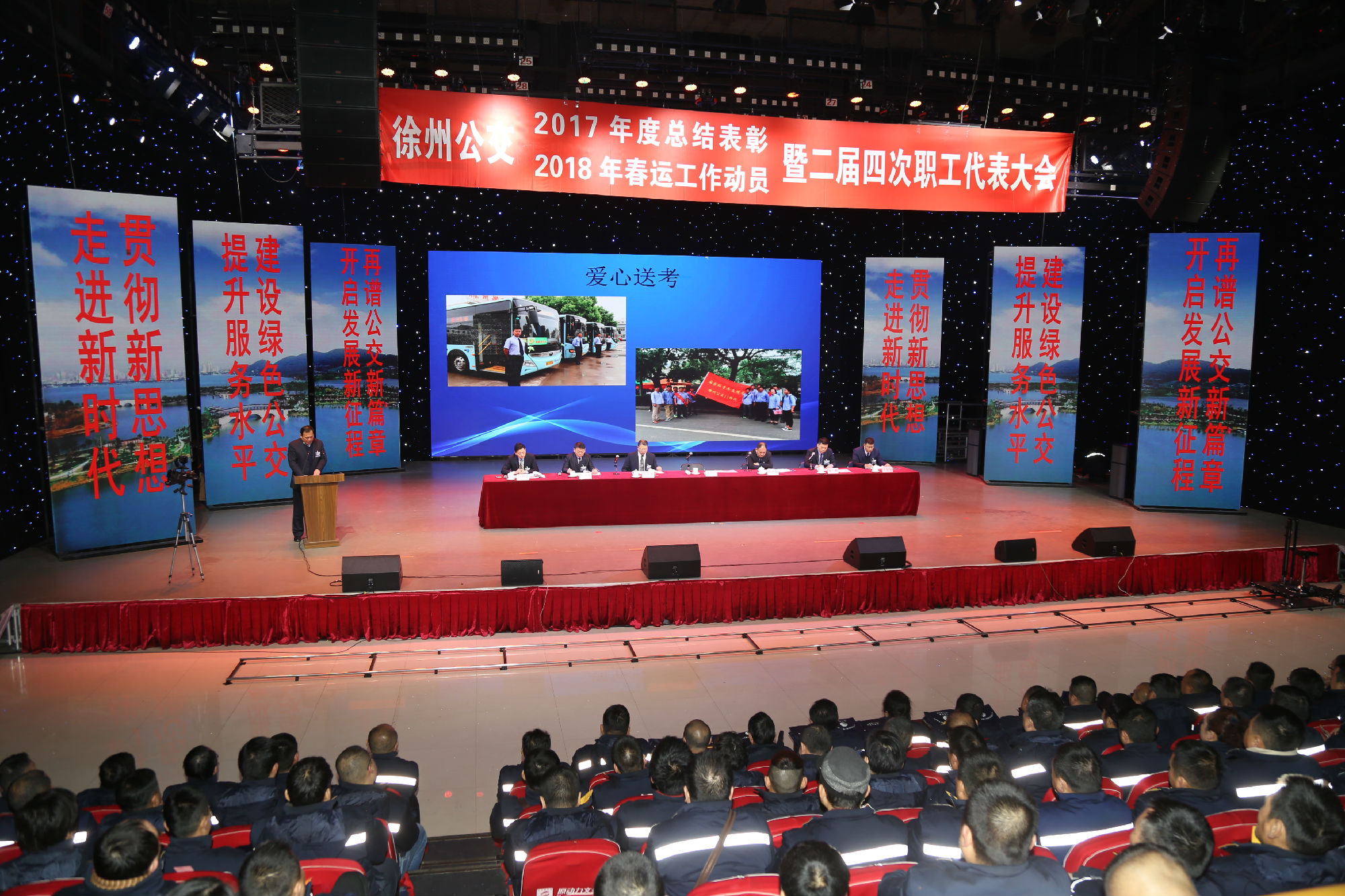 大會(huì)在莊嚴(yán)的國歌聲中拉開序幕。公司董事長、總經(jīng)理杜紅軍首先作經(jīng)理工作報(bào)告,對(duì)2017年“改革創(chuàng)新年”工作進(jìn)行了全面總結(jié):一、實(shí)施“同城同價(jià)”,優(yōu)化運(yùn)營管理,實(shí)現(xiàn)服務(wù)水平新突破。連續(xù)第五年面向全市征集線路線網(wǎng)優(yōu)化意見近3000條,據(jù)此新辟優(yōu)化線路29條。二、深化資源共享,在互聯(lián)網(wǎng)+企業(yè)管理上譜寫新藍(lán)圖。繼續(xù)深化集中維修,推行集中例檢。論證實(shí)施支付寶、微信、銀行卡閃付等智能化移動(dòng)支付方式。三、深化文明創(chuàng)建,打造優(yōu)秀公交,服務(wù)民生出行贏得新口碑。在國檢、省檢中未失一分,圓滿完成創(chuàng)建驗(yàn)收任務(wù)。投訴總數(shù)和有責(zé)投訴同比實(shí)現(xiàn)“雙下降”。乘客表揚(yáng)同比上升近20%。公司在2016年行風(fēng)熱線上線單位滿意度評(píng)議投票中名列榜首。率先打造公交行業(yè)禮讓斑馬線嶄新形象,圓滿完成公交反恐防暴工作。四、著力綜合管理,聚合內(nèi)生動(dòng)能,增強(qiáng)企業(yè)發(fā)展新優(yōu)勢。重新修訂2012版管理制度匯編和新版《徐州公交獎(jiǎng)懲條例》。五、踐行十九大精神,推進(jìn)和諧發(fā)展,開創(chuàng)黨群工作新面貌。接著,杜總分析了工作中存在的問題,提出下步工作重點(diǎn)。一、建設(shè)現(xiàn)代化公交,提升經(jīng)營管理水平,保障企業(yè)良性有序運(yùn)行;二、踐行集約共享理念,深化科技應(yīng)用,開創(chuàng)公交事業(yè)發(fā)展新局面;三、建設(shè)平安公交,提升服務(wù)口碑,展示文明公交新形象;四、踐行十九大精神,構(gòu)建和諧公交,開啟黨群工作新面貌。